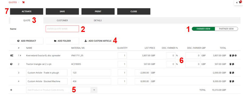 4.Own articles - You can use your own articles if you want to include products in the quote that you do not want to order from the Kverneland Group. This could, for example, be products that you already have in stock.